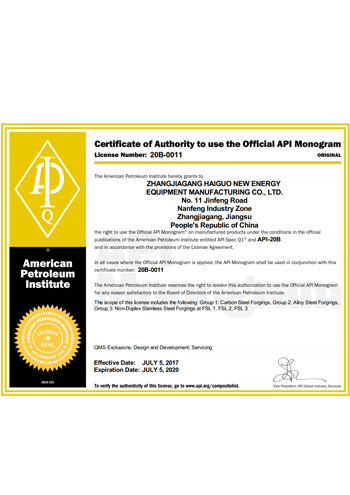 公司取得了美國ABS、法國BV、中國CCS、挪威DNVGL、韓國KR、英國LR、日本NK、意大利RINA等全球八大船級(jí)社的工廠認(rèn)證證書,建立了完善的產(chǎn)品質(zhì)量管理體系。先后獲得了美國API20B資質(zhì)證書、API6A資質(zhì)證書、APIQ1體系證書、TPG的NDT認(rèn)證證書、TPG 熱處理認(rèn)證證書、歐盟PED等認(rèn)證證書,同時(shí)也通過了一些國際客戶具有高度專業(yè)要求的資格認(rèn)證。